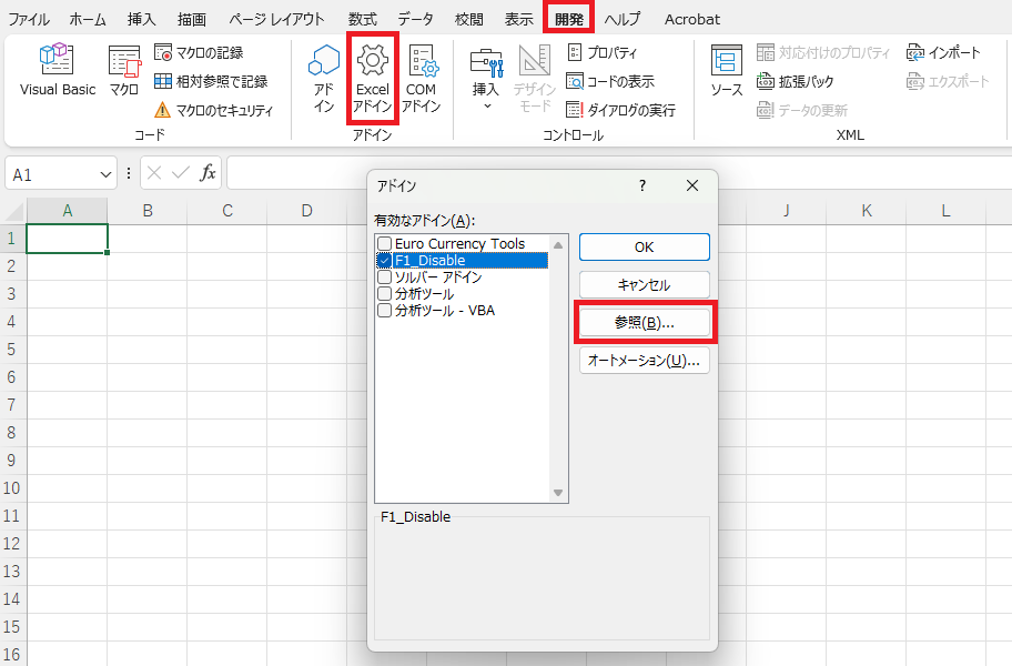 [開発] -> [Excelアドイン] -> ポップアップ画面で[参照]で選択
